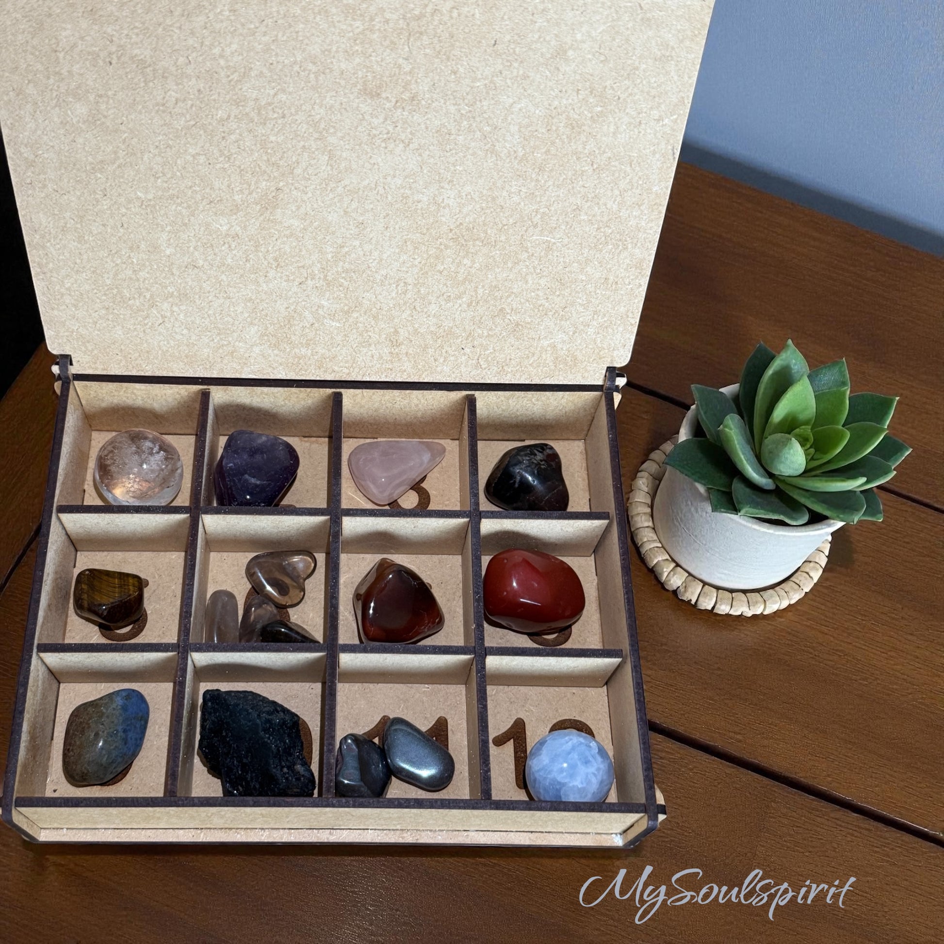 Sammelbox mit Heilstein-Beschriftung, gefüllt mit 16 Heilsteinen